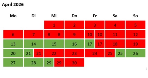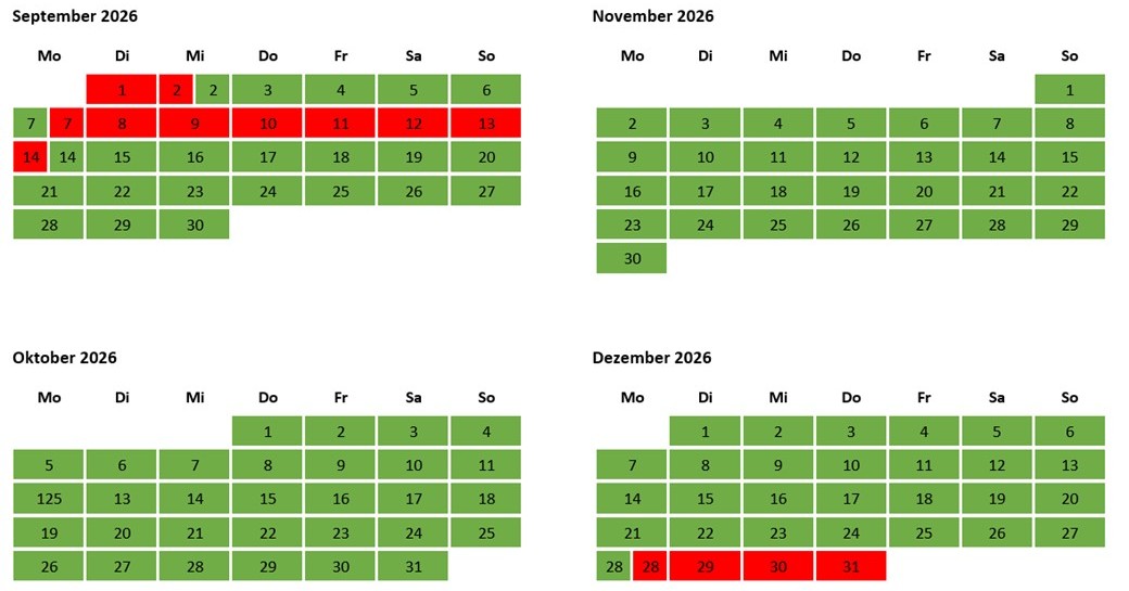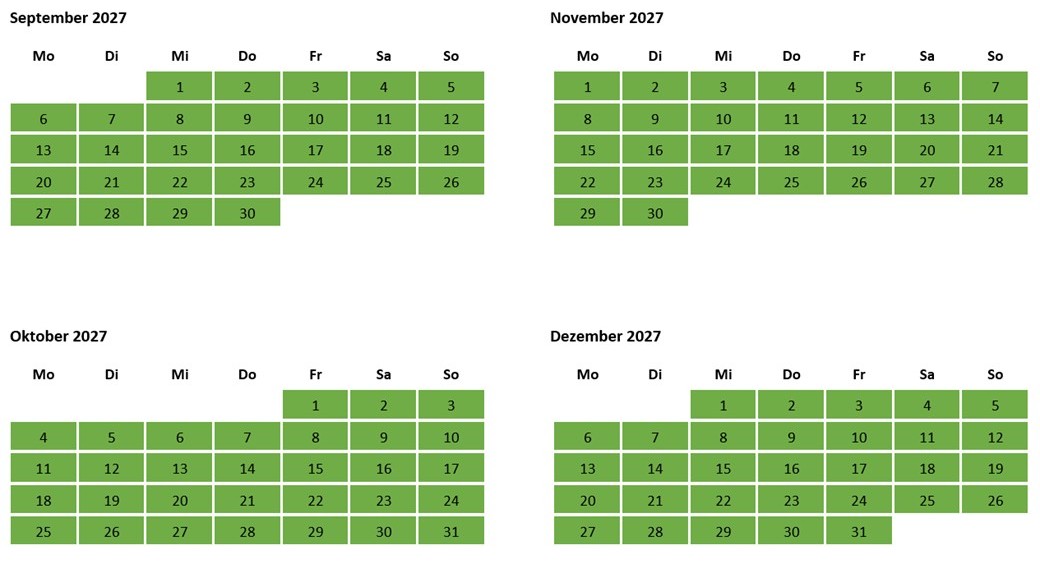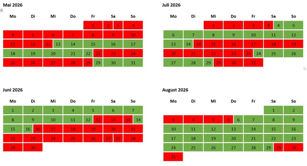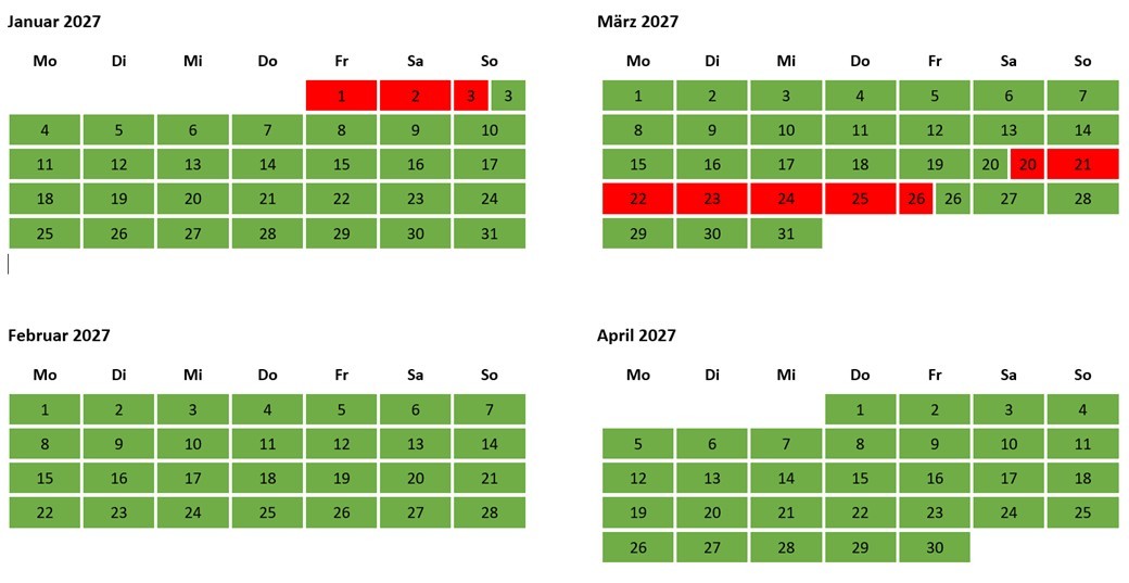 Übersicht der noch verfügbaren Termine (in grün), jetzt bereits bis zum 5.7.2027 buchbar: